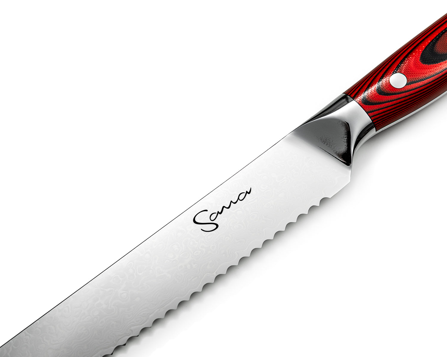 The Sana 8-inch Damascus bread knife is expertly crafted from 67 layers of Damascus steel surrounding a VG10 steel core. This construction ensures exceptional sharpness, long-lasting edge retention, and outstanding corrosion resistance.