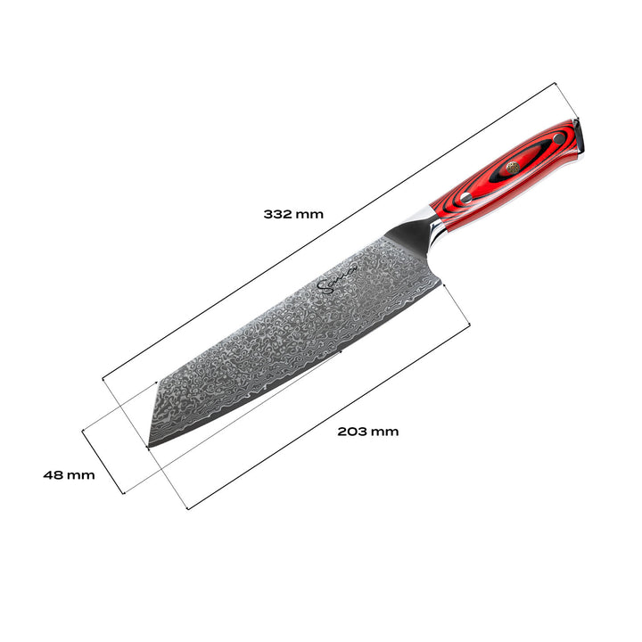 The Sana 8-inch Damascus chef’s knife is the ultimate tool for slicing, chopping, dicing, and mincing. Its wide blade and slightly curved edge make it ideal for both rocking cuts and precision work, whether you're prepping vegetables, meat, or herbs.