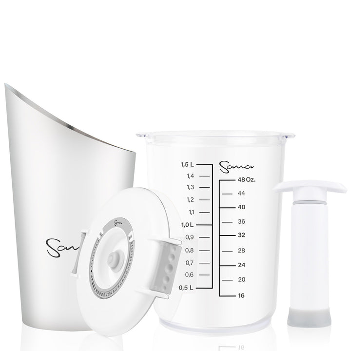 Included with the Sana 878 is our 1500 ml vacuum juice container. Keep your juice fresh and tasty without losing any nutrition to oxidation for up to 3 days. Just snap on the lid and use the included pump to remove the air from the container. If you follow a 500 ml daily celery juice regimen, you can make your juice for today, then vacuum seal enough juice for the next three days. Why juice every day when you can do it just twice a week? Built in to the lid is a handy calendar, so you will know how long to store the juice.