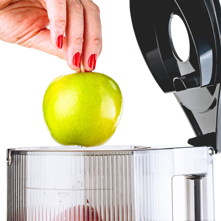 Why feed each piece of produce by hand, when the juicer will do it for you? Just fill the large 2-liter automatic hopper with your favorite produce, turn on the juicer, and walk away. The dual-bladed system sorts, cuts, and feeds the produce in the juicer, giving you time to do other things. A circular opening in the lid lets you throw in other ingredients without opening the lid.